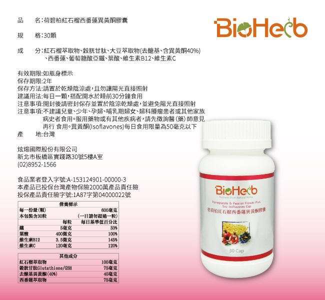 【碧荷柏】紅石榴西番蓮異黃酮膠囊(30顆/瓶) x1入