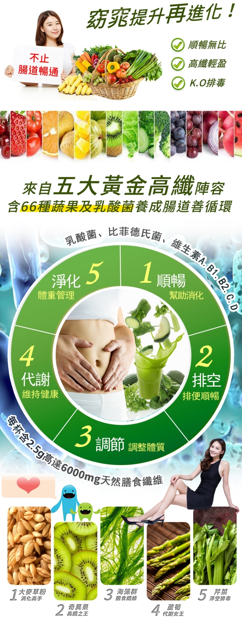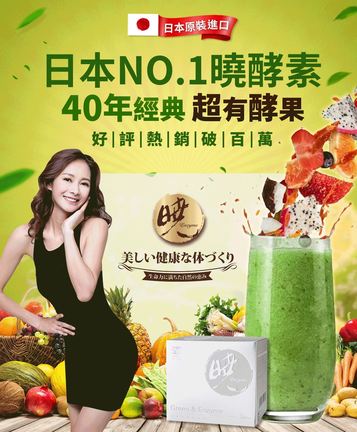 [成分] 葡萄糖、大麥草粉、大豆蛋白、果寡糖(甜菜根來源)、果寡糖、綠藻、甘油醇麟酸鈣、乳酸菌、南瓜、胡蘿蔔、昆布、明日葉、芹菜、菠菜、番茄、大蒜、巴西里香芹、維生素(A、B1、B2、菸鹼酸、C、D2)、比菲德氏菌、植物發酵粉末(蘿蔔、高麗菜、黃瓜、胡蘿蔔、馬鈴薯、蕃薯、蕃茄、蘋果、蓮藕、牛蒡、山藥、南瓜、薑、檸檬、海帶、李子、木瓜、鳳梨、西瓜、枇杷、金桔、哈密瓜、問荊、草莓、葡萄、梅、山白竹、紅豆、薏仁、小米、黍、杏仁、無花果、芥菜、芋頭、玄米、大豆、裙帶菜、香菇、奇異果、甜瓜、冬瓜、水芹菜、綠豆、柿子、紫蘇、桃) 。